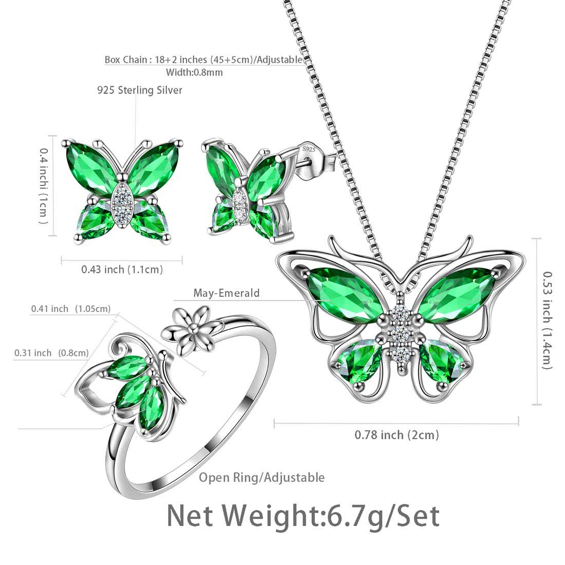 Aurora Tears Conjunto de joyería con piedra natal de mayo de mariposa: collar + pendientes + anillo