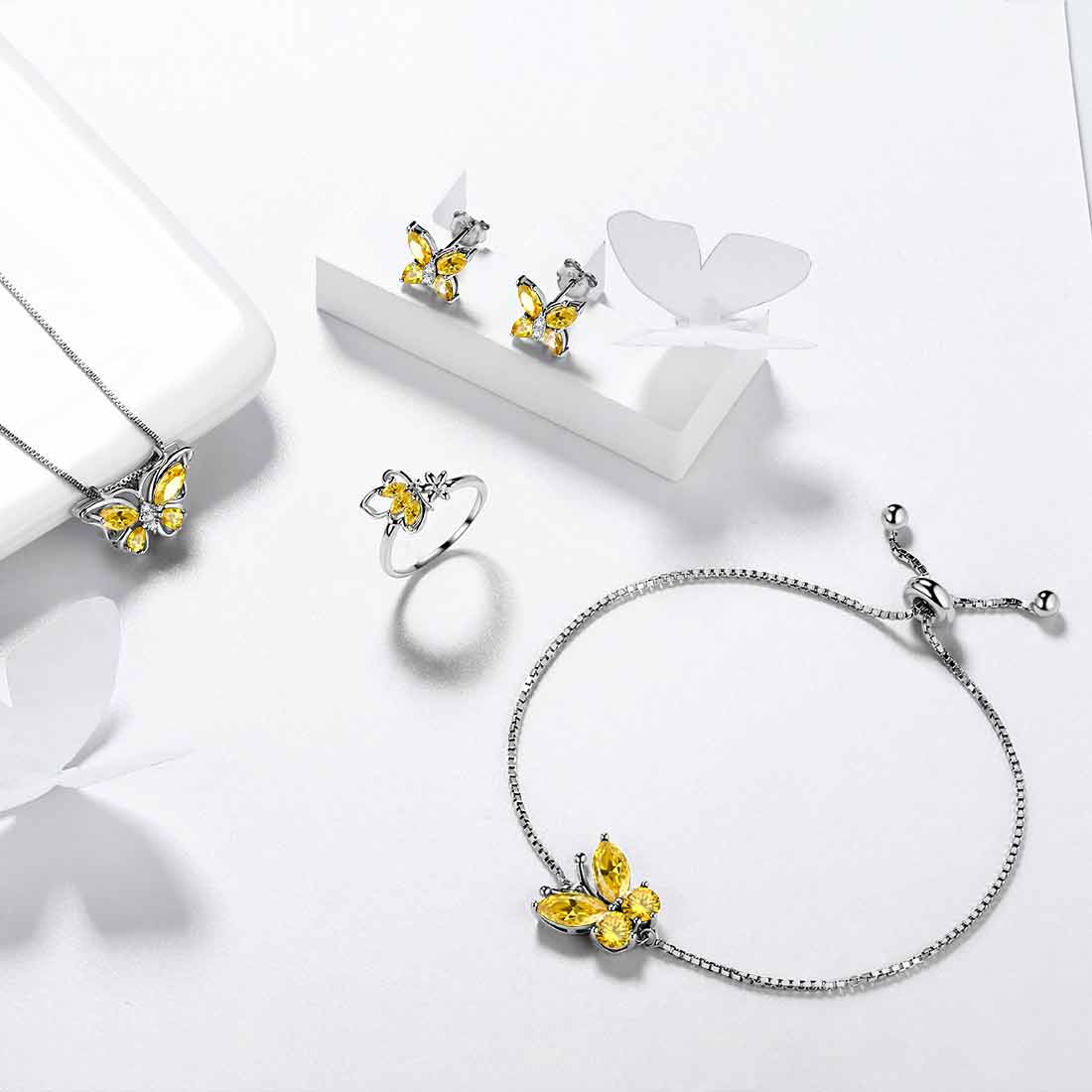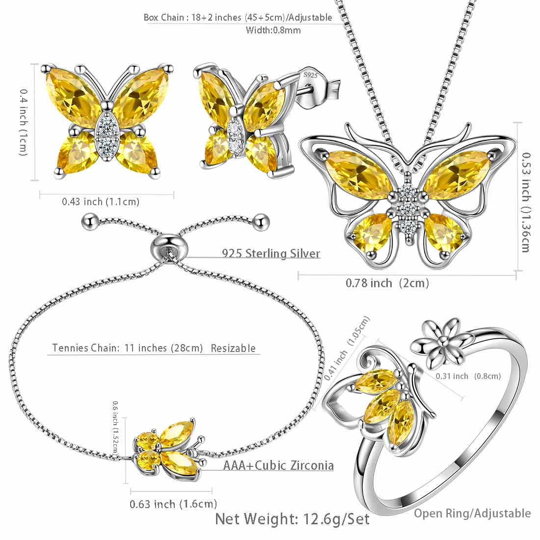 The unique design of this butterfly necklace & earrings & ring & bracelet jewelry matches Valentine's Day, Mothers Day, Anniversary Day, Christmas / Xmas, Thanksgiving Day, New Year, Birthday and Wedding or just daily life. And the trendy butterfly pendant chain, stud earrings, open ring and bracelet link are an ideal gift for your Wife, Mom, Daughter, Grandma, Girlfriend, Friends, your special someone, or just a gift for yourself.