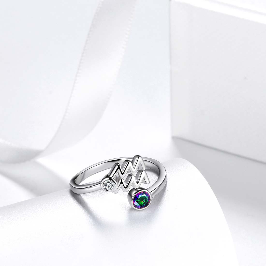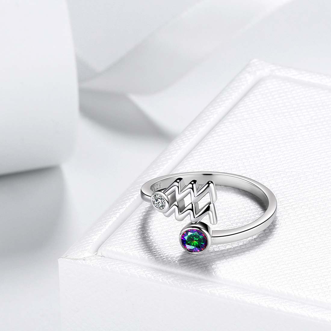 Anéis do Zodíaco Aquário para Mulheres e Meninas, Joias para Presente de Aniversário, Topázio Místico, Prata 925